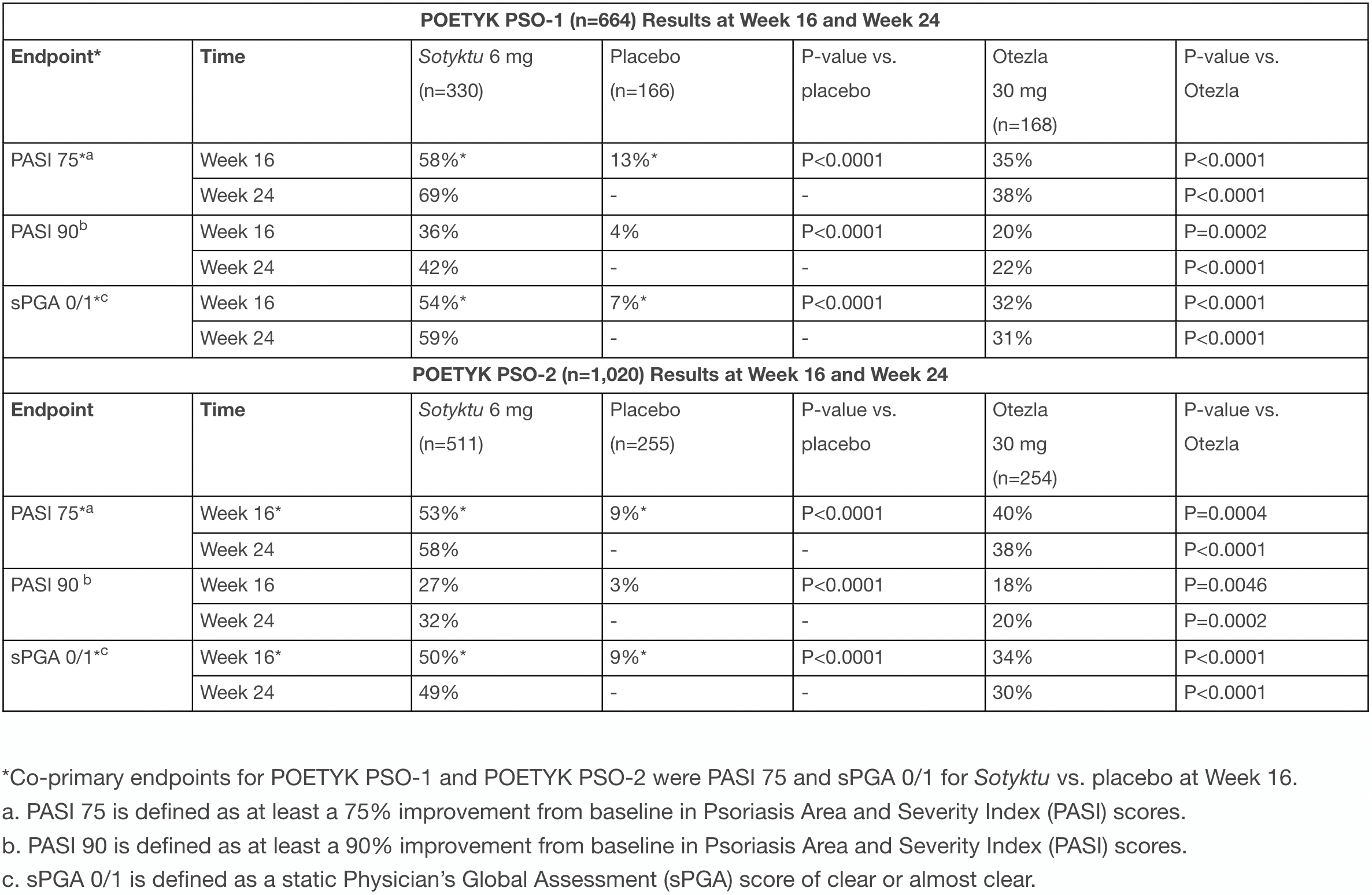 - PASI 90 after 16 weeks of treatment: in 36% and 27% of patients in POETYK PSO-1 and POETYK PSO-2, respectively