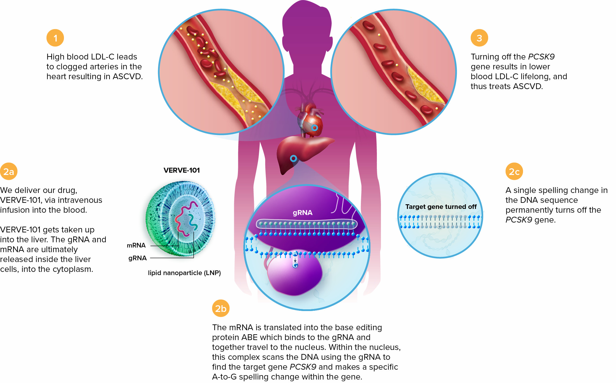According to an interim analysis of data from three patients collected one month after VERVE-101 administration, two subjects in the low-dose group demonstrated reductions in PCSK9 protein levels of 59% and 84%, with concomitant reductions in LDL-C levels of 39% and 48%. One subject in the high-dose group showed corresponding reductions of 47% and 55%, while the achieved drop in LDL-C levels was maintained for 180 days.