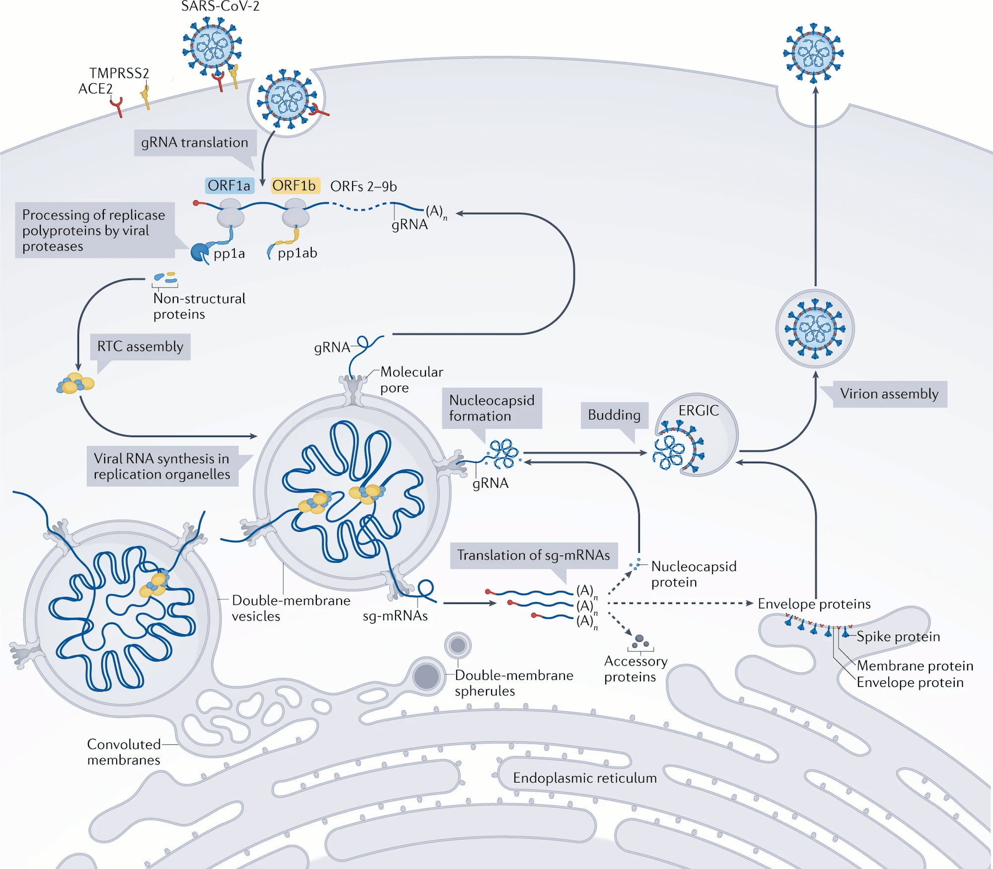 SARS-CoV-2, being an enveloped positive-sense (+) RNA virus, enters host cells by binding its S protein to angiotensin-converting enzyme 2 (ACE2) on the cells and then releasing genomic RNA (gRNA) into the cytoplasm after uncoating. The cell’s ribosomes then translate the gRNA into the two major polyproteins, pp1a and pp1ab. Proteases embedded in viral nonstructural proteins 3 (Nsp3) and 5 (Nsp5), papain-like protease (PLpro) and chymotrypsin-like protease (3CLpro), respectively, cleave pp1a and pp1ab into 16 nonstructural proteins that assemble into replication–transcription complexes (RTCs). The latter produce new gRNAs and a set of subgenomic RNAs (sgRNAs) including open reading frames (ORFs) that encode structural viral proteins such as S protein, membrane (M), envelope (E), and nucleocapsid (N) proteins, as well as a number of accessory proteins. The newly created gRNAs are translated to produce additional nonstructural proteins, serve as a template for further RNA synthesis, or are packaged into new virions.