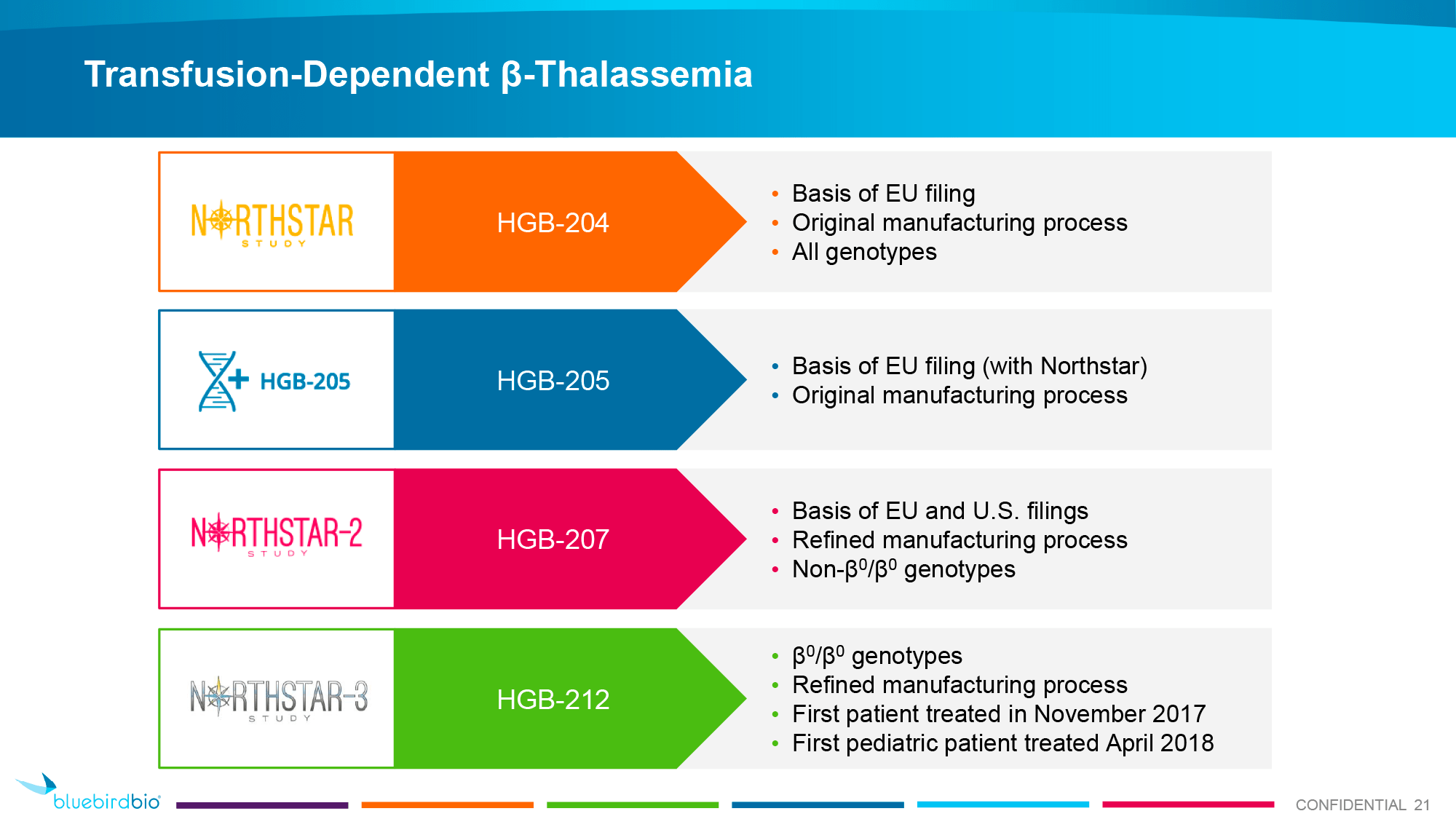 The European regulator relied on the results of multiple clinical trials of Zynteglo: completed HGB-205 (NCT02151526) and HGB-204 (Northstar, NCT01745120) phase 1/2, ongoing HGB-207 (Northstar-2, NCT02906202) and HGB-212 (Northstar-3, NCT03207009) phase 3, long-term observational LTF-303 (NCT02633943).
