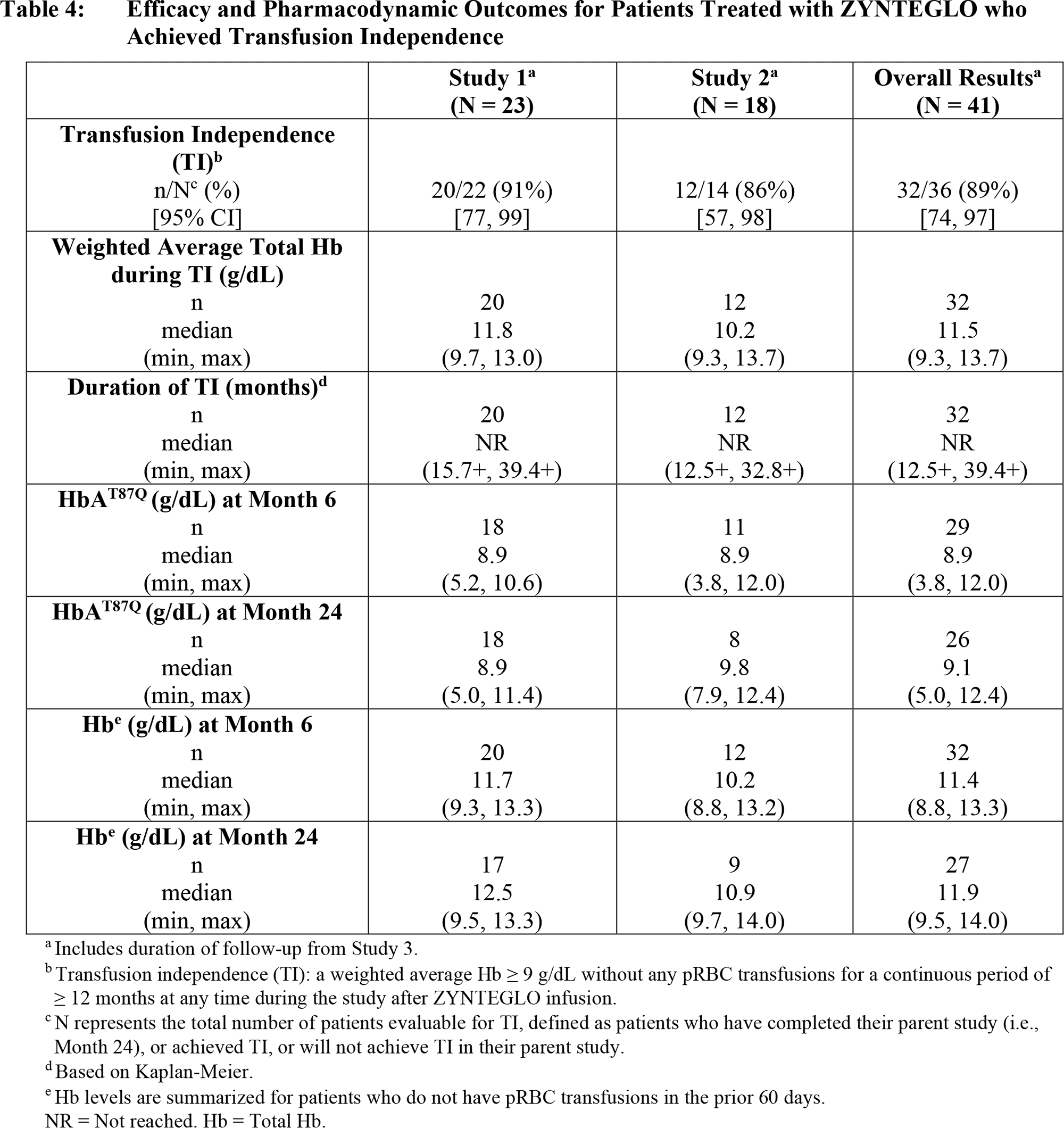 - median duration of independence from blood transfusions not established: 15.7+ to 39.4+ months and 12.5+ to 32.8+ months, combined 12.5+ to 39.4+ months